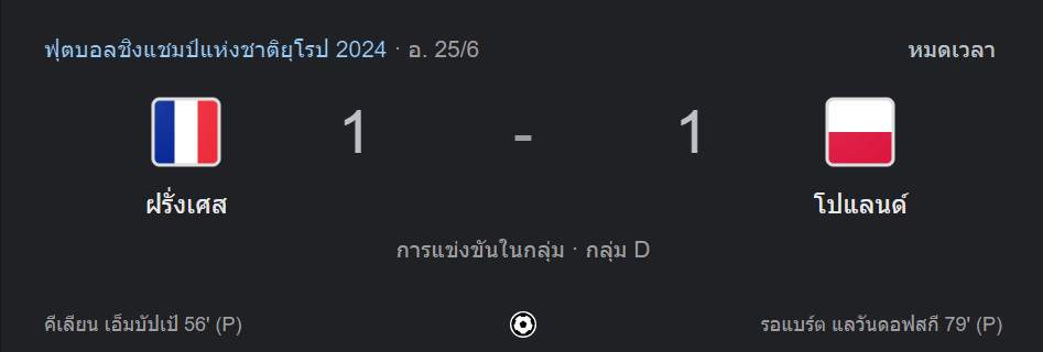 ฝรั่งเศส ไม่ได้เร่งเกมเพื่อเอาประตู ส่วน โปแลนด์ ก็ไม่ได้ปล่อยชิว ทำให้ครึ่งแรกไร้สกอร์และความหวาดเสียว ส่วนเกมในครึ่งหลัง ฝรั่งเศส ได้จุดโทษขึ้นนำ 1-0 จาก เอ็มบัปเป้ ขณะที่ โปแลนด์ ก็ได้จุดโทษเช่นกัน ซึ่งครั้งแรกยิงติดเซฟ แต่โชคดีที่ผู้รักษาประตูขยับออกจากเส้นก่อน ทำให้ได้ยิงใหม่และตีเสมอเป็น 1-1 จบเกม ตราไก่ เก็บเพิ่มได้ 1 คะแนน เข้ารอบในฐานะอันดับ 2 ของกลุ่ม